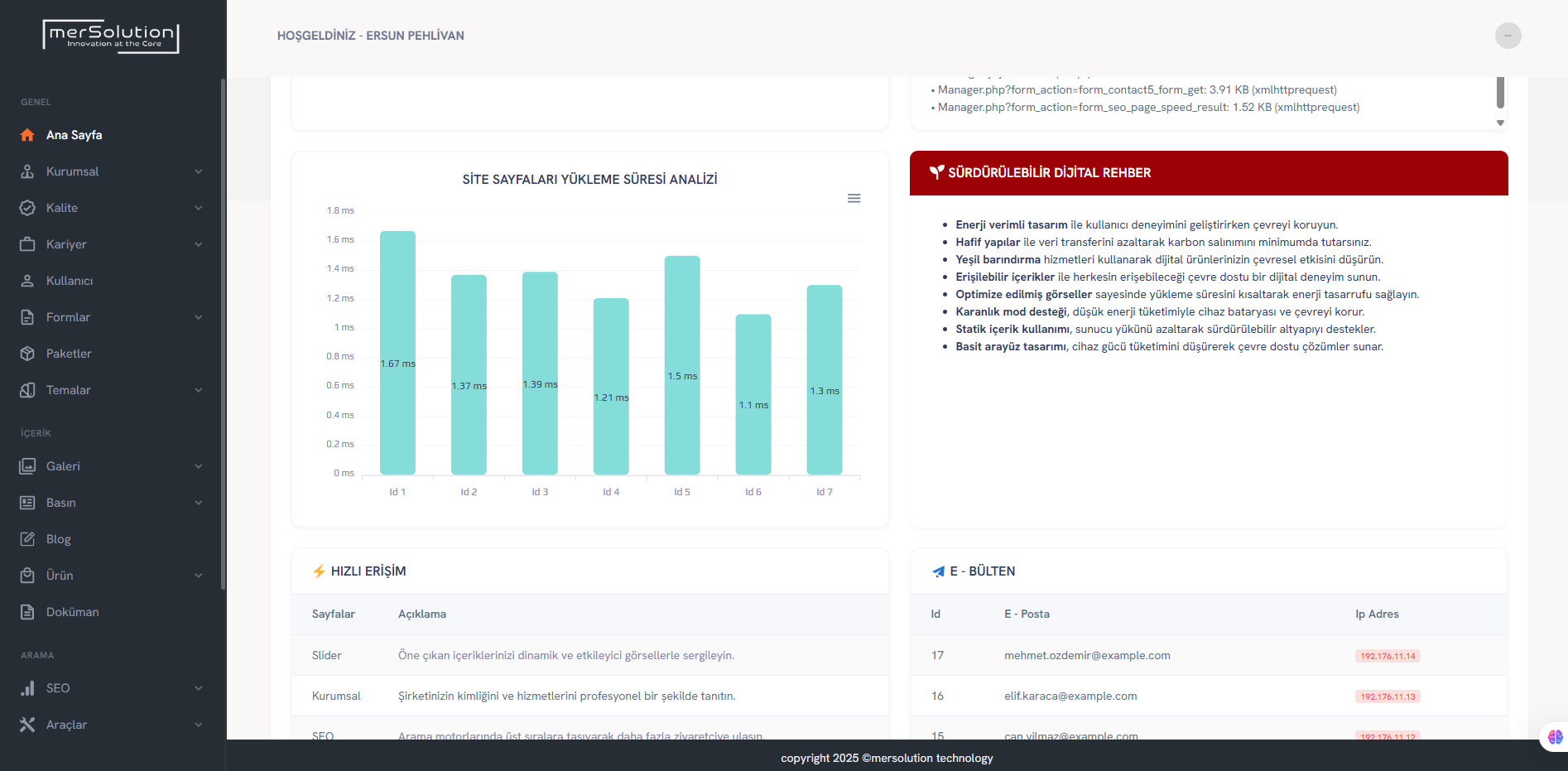 Panel üzerinden veritabanı yedeği alma, önbellek temizleme ve sistem log takibini kolayca yapabilirsiniz.